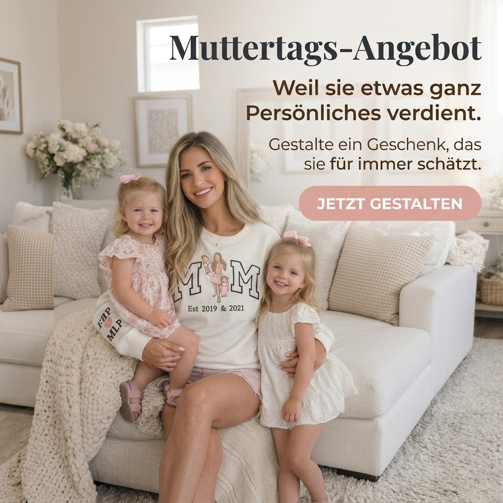 Glitzerndes Mama-Sweatshirt mit gestickter Applikation und Kindernamen auf dem Ärmel