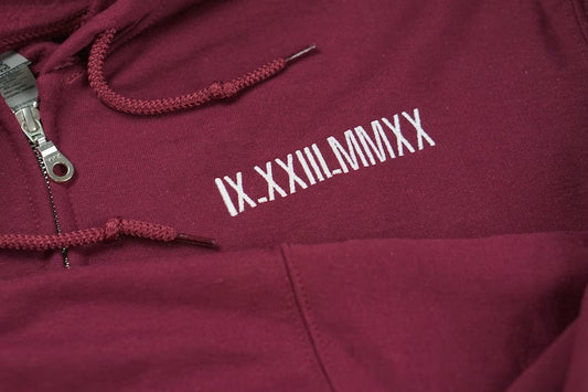 Römische Ziffern-Jubiläums-Kapuzenpullover mit Stickerei und Reißverschluss | Bestickter Kapuzenpullover | Jubiläums-Datums-Hoodie