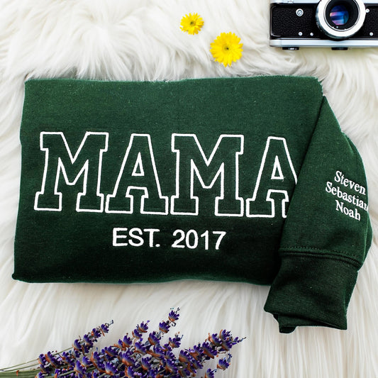 Besticktes Mama-Sweatshirt, personalisiertes Mama-Sweatshirt mit Kindernamen am Ärmel, neues Mama-Outfit, Muttertagsgeschenk für Mama