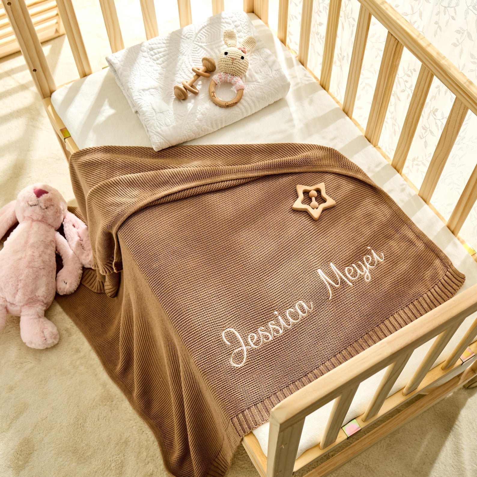 Diese personalisierte Babydecke aus hautfreundlicher Baumwollstrickware verwandelt sich in ein kuscheliges Erbstück! Besticken Sie sie mit dem Namen Ihres Kleinen, seinem Geburtsdatum oder einem süßen Spruch – jedes Detail wird zu einer unvergesslichen Erinnerung.